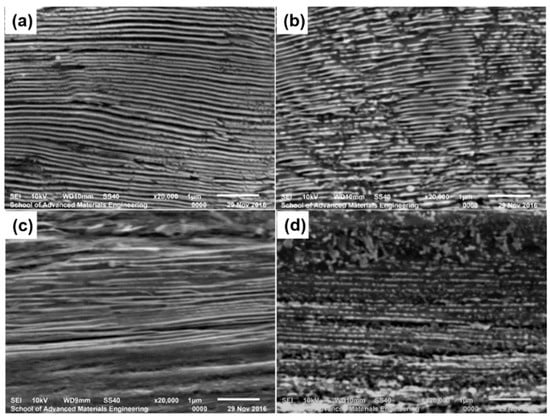 SEM micrographs of steel wires received strains of (a) 0.99 and (b) annealed at 500 °C for 1 h, (c) received strains of 2.38, (d) and annealed at 500 °C for 1 h.