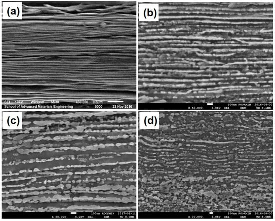 SEM micrographs, showing the microstructural evolution, (a) as-drawn with ε = 2.38, and annealed at 500 °C for annealing time of (b) 2 min, (c) 20 min, and (d) 1 h.