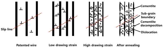 Mechanical properties of steel wires reflect the variations of microstructural features during wire drawing and annealing. Figure 14 shows a schematic diagram, describing the evolution of pearlitic microstructure during wire drawing and subsequent annealing.