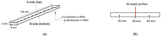 The residual stresses (RS) were measured with a portable X-ray diffraction (XRD)-based system XStress 3000 residual stress diffractometer (Stresstech Oy, Jyväskylä, Finland) with the modified Chi method [35]. Measurements from all the samples were done along the longitudinal (0) and transverse directions (90) in relation to the specimen surfaces (illustrated in Figure 1a). The residual stresses from an austenitic steel at lattice plane (311) with a diffraction angle of 148.9° were used with chromium K beta radiation. Measurements were done with 3 mm diameter collimator. In total, six different surface RS measurements were taken from one sample (Figure 1b). The measurement locations were from both surfaces A (top) and B (bottom), from 35, 50 and 65 mm from the other end in the centerline of the sheet sample. One of the locations (50 mm) was in the middle of the samples. Residual stress depth profiles were taken from as-built, HT and reference samples together with certain shot peened samples (one reference sheet, as-built and shot peened sample). At first, the surface residual stress measurement was done. Next, material was removed by electrolytical polishing with the MoviPol-5 electrolytical polisher (Struers, Ballerup, Denmark) with A2 electrolyte containing perchloric acid and ethanol. The removed layer was measured with a dial gage. This routine was repeated up to 100–120 µm depth below the surface.