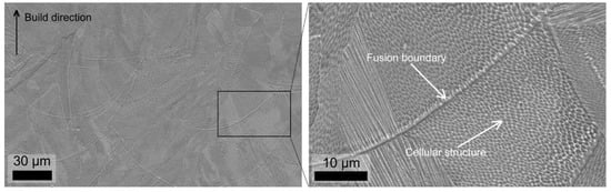The microstructure of the AM 316L in as-built and after stress relief annealing conditions was studied by the optical microscope and FESEM-EBSD (Figure 3 and Figure 4). The L-PBF selectively melts the powder layers which then solidify, bowl-shaped fusion boundary structures are visible in the as-built structure and the elongated, different-sized grains are oriented parallel to the build direction, where temperature is higher in the upper printed layer (Figure 3a). The overlapping features are resulting from the solidification of the melt pool after each laser scan. The layer thickness in the AM was 40 µm. The surface layer thickness was, however, larger, as seen in the Figure 3a, because the top layer processing parameters (lower laser power, lower speed) were different. In the stress relief annealed AM sample (Figure 3b), the melt pool boundaries were no longer as visible as in the as-built sample (Figure 3a). Figure 4 presents the FESEM images of the AsB 316L sample, showing the cellular structure within the grains. The cell size was measured to be, on average, 0.7 µm in diameter with the intercept technique. The cellular structure changed at the austenite grain boundaries and some of the grains continued across the fusion boundaries.
