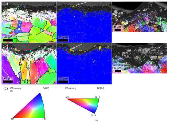 The microstructure of the cross-sectional samples was studied by an optical microscope DM 2500 M (Leica Microsystems, Renens, Switzerland) and a field emission scanning microscope (FESEM) ULTRAplus (Zeiss, Jena, Germany). The microstructure of the samples was also studied by a Symmetry electron backscatter diffraction (EBSD) system (Oxford Instruments, Abingdon, United Kingdom) combined to the FESEM. A step size of 0.15 µm and an acceleration voltage of 15 kV were used. The cross-sectional EBSD samples were prepared by a traditional metallographic method followed by a final polishing using colloidal silica suspension (0.04 µm). The EBSD data were collected by the AZtec software (Oxford Instruments, Abingdon, United Kingdom) and post-processed and analyzed by the CHANNEL 5 software (Oxford Instruments, Abingdon, United Kingdom). In the EBSD results, a band contrast (BC) map represents the quality of the Kikuchi diffraction pattern for each measurement pixel. In the BC map, bright color means that the pattern quality is good, and the crystal orientation can be determined. Black signifies that the pattern quality is poor, and indexing is not possible. The colors in the inverse pole figure (IPF) maps correspond to the crystallographic orientations parallel to the observed plane (z direction), as indicated by a colored stereographic triangle, i.e., an IPF coloring key. Different boundaries were also analyzed and marked on the BC + IPF maps. Low-angle boundaries were considered when the misorientation angle was 2–10°, high-angle boundaries with the angles >10° and twin boundaries (Σ3) were defined by a 60° misorientation along the axis <111>. Phase maps show the distribution of iron and silicon carbide.
