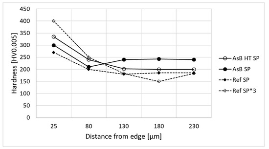 Hardness depth profiles of the cross-sectional samples: AsB HT SP, AsB SP, Ref SP (1 s peening) and REF SP (3 s peening).