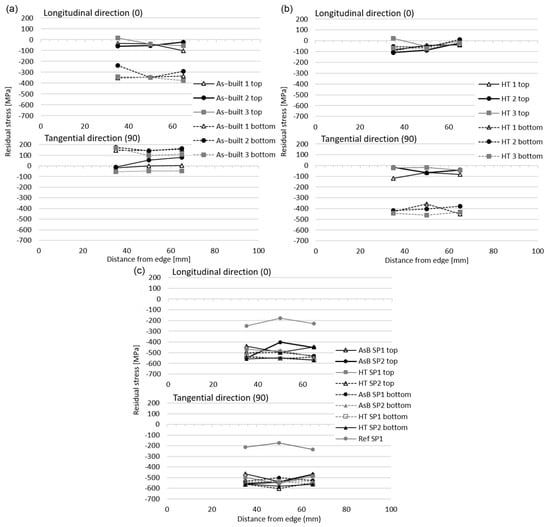 (a) Surface residual stresses of three AsB AM samples (top) and (bottom) surfaces in longitudinal and tangential directions. Typical deviation was 20–40 MPa. (b) Surface residual stresses of three stress relief annealed AM samples (top) and (bottom) surfaces in longitudinal and tangential directions. Typical deviation was 20–40 MPa. (c) Surface residual stresses of shot peened samples AsB, HT and Ref (top), and (bottom) surfaces in longitudinal and tangential directions.