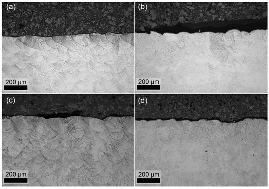 The possibility of SCC was studied by the 237 and the 674 h immersions in magnesium chloride at 80 °C in four-point bending rigs. The cross-sections of the samples after immersion tests were studied with an optical microscope at two different depths: surface and 0.5 mm depth from the surface. Any signs of corrosion or cracking were not detected in the AM components, AsB, AsB + HT or references (the 316L sheet and the 316L sheet with the weldment). Figure 9 shows examples of optical micrographs of (a) AsB sample and (b) AsB HT material after first corrosion test, and (c) AsB sample and (d) AsB HT material after second corrosion test with no signs of SCC.