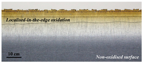 General view of the localised-in-the-edge oxidation of an AISI 430 ferritic stainless steel after bright annealing.