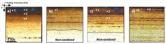 Figure 2 shows detailed plan view images obtained by using an optical profilometer of selected specimens after bright annealing. These specimens were acquired from the oxidised surface of the coil edge represented by the coloured area in Figure 1. The bright region that is clearly identified in Figure 2b,c corresponded to the non-oxidised surface of the steel. Figure 2a,c show a more intense blue colour by the edge, which changed gradually in the former and radically in the latter. However, a lower intensity of the colour by the edge could be seen in the specimens corresponding to Figure 2b,d compared to the other.