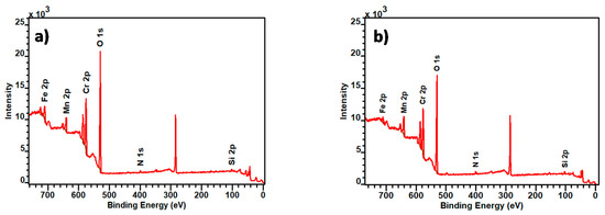 The X-ray photoelectron spectroscopy (XPS) technique offered both quantitative and qualitative information at a depth regime of 2–10 nm, and it offered a better understanding of the surface chemical environment of specimens studied after the bright annealing process. For this purpose, survey and high-resolution O 1s, Cr 2p, Fe 2p, Mn 2p, N 1s and Si 2p spectra were recorded. XPS measurements were carried out using a Kratos Axi Ultra DLD spectrometer equipped with an X-ray monochromatic source (50 W) and Al Kα primary X-ray beam (hν = 1486.6 eV). Spectral fitting was performed using CasaXPS version 2.3.18.