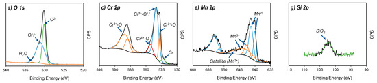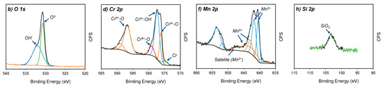 According to the fitting lines of Mn 2p spectra in Figure 4e,f, four peaks centred at 640.1, 641.3, 642.7 and 643.6 eV were detected in the Mn 2p3/2 region. Moreover, a satellite peak was found at 647.1 eV. In addition, the Mn 2p1/2 region of each spectrum displayed two peaks, which were identified in 651.6 and 653.1 eV positions. The peaks centred at 640.1, 641.3, 651.6 and 653.1 eV were assigned to Mn2+ ions [20]. The satellite feature identified in 647.1 eV is also a typical feature of Mn2+ [21,22]. In agreement with Bao et al. [20], the Mn2+ peak position was determined by oxide structures, where the BE 640.1 and 641.3 eV are attributed to the occupation of Mn2+ ions in the tetragonal site and octahedral site, respectively. Mn2+ ions of tetragonal sites are associated with MnCr2O4 spinel structures [23], whereas octahedral sites are ascribed to the MnO structure [24].