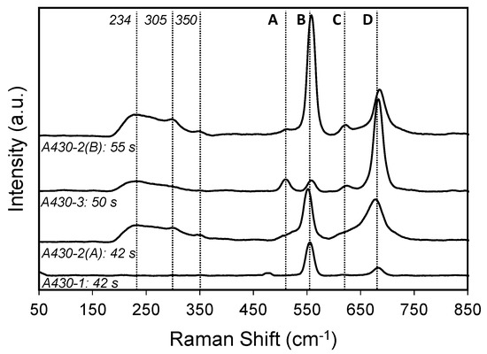 Four main peaks (A, B, C, D) are identified in these spectra, where the intensity of each band varies from one sample to the other. As it can be shown in Figure 5, the bands labelled as B, C and D are the main peaks of the oxide scale in all specimens. According to literature [30,31,32], peaks B and C at 555 and 618 cm−1 correspond to the Cr2O3 structure. The peak centred at 555 cm−1 seemed to be asymmetric. This asymmetry could be due to the overlap of the Cr2O3 peak with another peak associated with the presence of MnOOH. According to the literature [33], the main peak of MnOOH is identified at 558 cm−1. Moreover, the peaks A and D at 508 and 685 cm−1 are attributable to MnCr2O4 spinel [10,30]. Furthermore, a broad peak was found at 230 cm−1, which is associated with amorphous Cr2O3 [32]. This band was identified in A430-2(A), A430-2(B) and A430-3 samples. A430-2(A) and A430-2(B) spectra displayed a weak peak centred at 305 cm−1, which corresponds to Mn2O3 [33]. Finally, a weak band was observed at 350 cm−1 in A430-2(A) and A430-2(B) spectra, and it is associated with Si oxides.