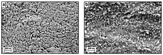 Figure 7a,b show SEM plan view images of points 2 and 3, respectively, from Figure 2a, which corresponds to the A430-1 specimen. These points represent blue and the border between the blue and yellow oxidation colours, respectively. The morphology associated with the blue oxidised surface in Figure 7a was uniform with no defined oxide crystals, which encouraged the formation of cracks. On the other hand, heterogeneous morphology based on fine oxide crystals can be identified in the blue–yellow oxidised area of Figure 7b. In this image, some larger oxide crystals, labelled as S1, could be detected.
