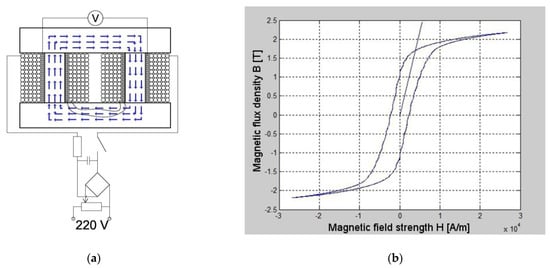 Magnetization characteristics of nodular cast iron alloy AISI 60-40-18: (a) measurement scheme; (b) hysteresis of casting iron magnetization.