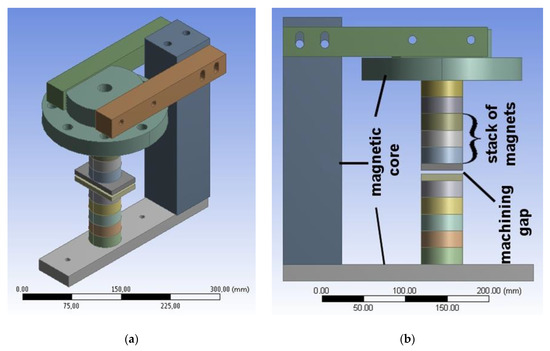 A vector model (Figure 4), which was examined using finite element method analysis, was created for the magnetic circuit used in the experiment consisting of an AISI 60-40-18 cast iron element, permanent magnets, and an adjustable machining gap. The finishing zone was separated from the magnets by duralumin separators [23].