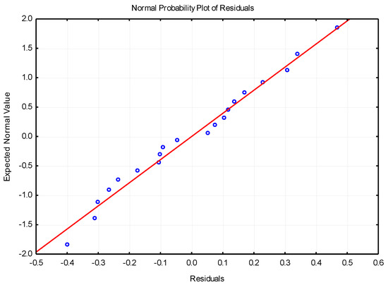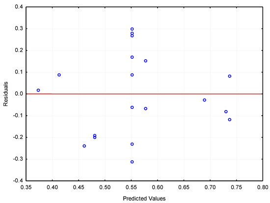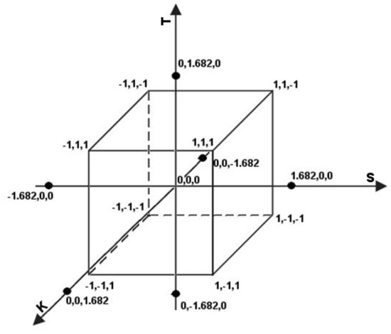 In order to investigate the influence of selected input parameters on surface roughness, a five-level, three-factor, rotatable, orthogonal design of Hartley’s experiment was used (Figure 7), for which the value of the arm of the star radius at 20 tests was a = 1.682 [23] (Table 4).