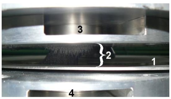 The shaped abrasive tool during the machining: 1—work piece, 2—flexible abrasive tool, 3,4—permanent magnets.