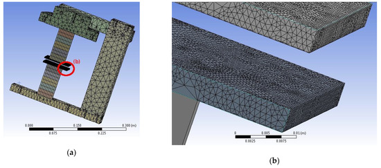Mesh of finite elements (tetrahedrons, quality 0.748, aspect ratio 2.319, skewness 0.329, orthogonal quality 0.675): (a) experimental station; (b) densification on the surface of the separators in m.