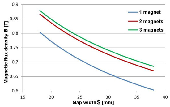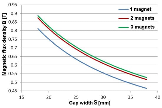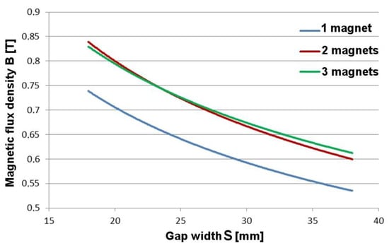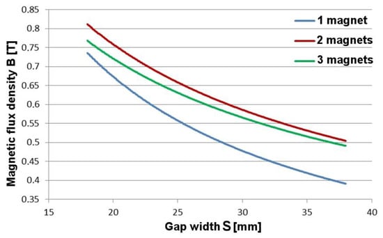 Impact on the magnetic flux density in the center of machining gap depending on the machining gap width and number of magnets, obtained from measurements.