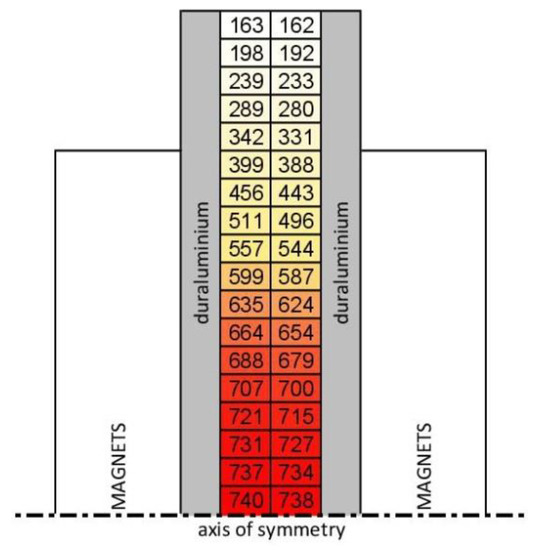 The results of induction distribution measurement in the machining gap [×10−3 T]. The distance between magnets amounts to 28 mm.