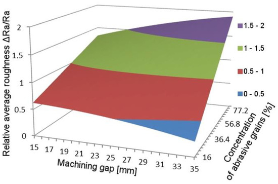 The impact of machining gap width and concentration of abrasive grains, at constant processing time (T = 15 min), on relative change in roughness ΔRa/Ra (correlation coefficient R = 0.59).