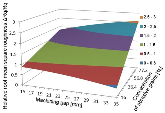 The impact of machining gap width and concentration of abrasive grains, at constant processing time (T = 15 min), on relative change in roughness ΔRq/Rq (correlation coefficient R = 0.57).