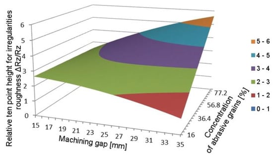 The impact of machining gap width and concentration of abrasive grains, at constant processing time (T = 15 min), on relative change in roughness ΔRz/Rz (correlation coefficient = 0.58).