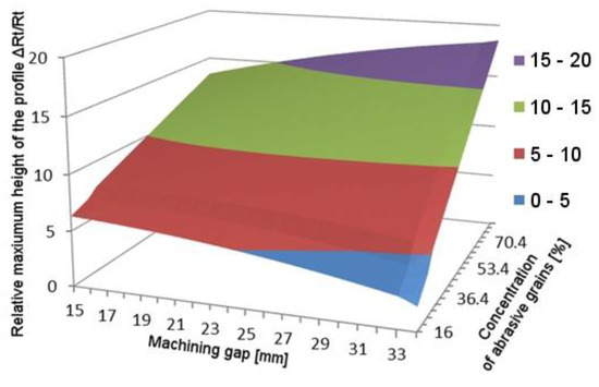 The impact of machining gap width and concentration of abrasive grains, at constant processing time (T = 15 min), on relative change in roughness ΔRt/Rt (correlation coefficient R = 0.57).