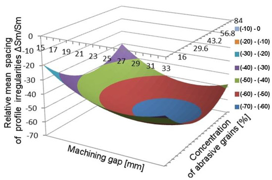 The impact of machining gap width and concentration of abrasive grains, at constant processing time (T = 15 min), on relative change in roughness ΔSm/Sm (correlation coefficient R = 0.74).