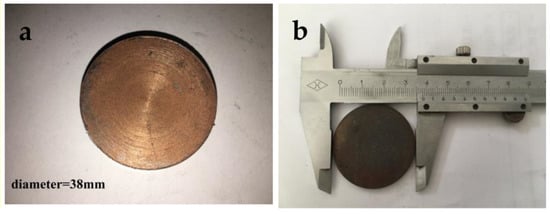 The detailed preparation methods for the composites are described below. Diamond particles with different volume fractions were mechanically mixed with the pure copper powder for 2 h, and then each cold-pressed sample was compacted under a pressure of 500 MPa for 5 min. Afterwards, the slurry was extruded at elevated temperatures in a graphite mold at a pressure of 50 MPa and held for 10 min until it cooled down. The cooling rate was 10 K min−1 with circulating cooling water. These diamond/Cu composite samples had cylindrical shapes with diameters of 38 mm and thicknesses of 3 mm, as shown in Figure 1b.