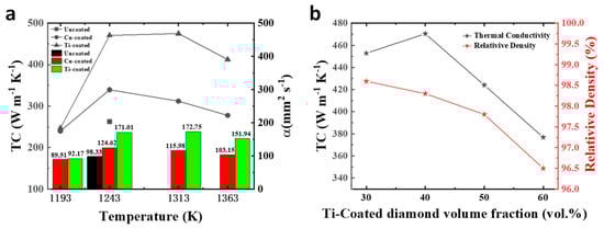 (a) Thermal conductivity (TC) and thermal diffusivity of 40 vol.% uncoated diamond/Cu, Cu-coated diamond/Cu, Ti-coated diamond/Cu composites under different temperatures; (b) TC and relative density for 30–60 vol.% Ti-coated diamond/Cu composites fabricated at the same temperature of 1243 K.