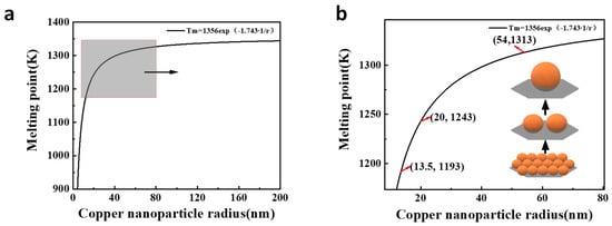 Based on the above analysis for the microstructure and TC values of the Cu-coated diamond/Cu composites, there was a nano effect in which the deposited nanosized copper particles behaved differently from the micron-sized particles. Ma et al. [27] reported the relationship between the sizes of metal nanoparticles and their melting points. Therefore, the melting points, which correspond to the size of the deposited nanosized copper particles, can be derived from Equations (1) and (2):
