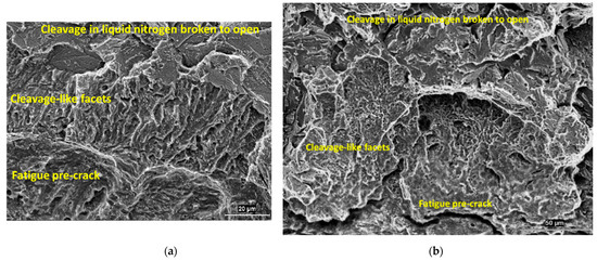 Typical cleavage-like facets of EAC initiated in low-alloy steels (LAS) growing from fa-tigue pre-crack tip while tested by constant load: (a) 22NiMoCr3-7 exposed to simulated boiling water reactor (BWR) conditions at 288 °C for 1904 h at stress intensity of 49 MPam1/2; (b) CrNiMoV exposed to simulated VVER water saturated with oxygen (>1 ppm) at 320 °C for 1023 h at 36 MPam1/2. The fracture surfaces were chemically cleaned to remove oxides.