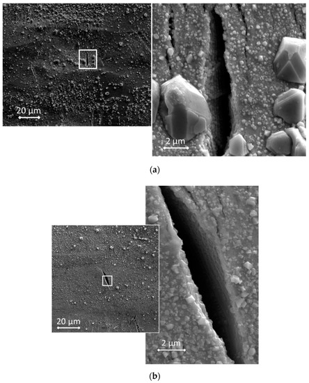 As it has been recognized, EAC initiation does not occur easily and EAC does not sustainably propagate in the LAS and CS materials in the HT water environments subjected to constant loadings in the elastic regime [22,24,25,26,27]. EAC initiation from smooth, defect-free surfaces subjected to a static load is generally observed only for stresses above the HT yield strength, quasi-stagnant water flow conditions, and increased concentration levels of anionic impurities, such as SO42− or Cl− [24]. The crack path under these conditions is usually transgranular (TG) [24,26]. EAC in elastoplastic load conditions is termed strain-induced corrosion cracking (SICC) [24,26]. In simulated HT water containing oxygen, EAC initiates more easily and transgranular cleavage-like crack growth is mostly observed (Figure 2a,b). Sporadically, the intergranular (IG) fracture in local islands is found, e.g., in lab testing of CrMoV and CrNiMoV steels in oxygenated HT water [27].