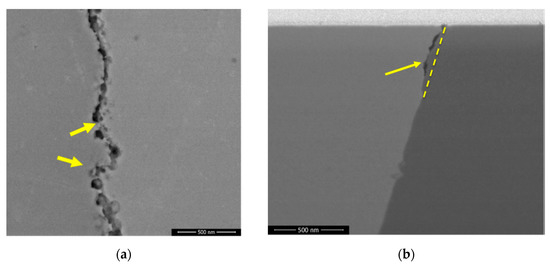 Many studies and material analyses have been performed in the last decades with the aim to understand the EAC mechanism in LWR systems [3,4,5,6,7,8,9], although some processes, especially crack initiation, need further understanding. Crack initiation is the longest stage of the degradation process and thus the most important regarding a component’s lifetime. This process is the least explored and is not clearly defined. From an engineering point of view, crack initiation is considered to occur when the crack is detectable by non-destructive examination, where detection limits can be several millimeters. This is called “practical” crack initiation. In contrast, with current microscopy techniques, it is possible to investigate submicron-sized cracks and those also considered as crack initiation. This is then called “physical” crack initiation.