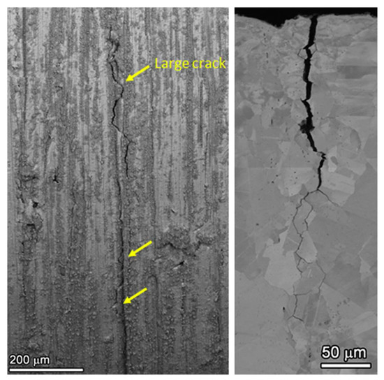 SEM-BSE images of Alloy 600 (as a 60-grit ground finish plate specimen), which has been exposed for 6900 h to simulated PWR water (in Ni/NiO transition conditions, and at 360 °C) and to the load at the yield strength level, showing a typical morphology of a large crack, as seen on the surface and in cross-section, reproduced from [21], with permission from Elsevier, 2020.
