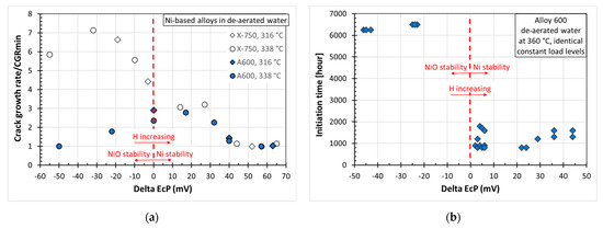 EAC susceptibility of Ni-based alloys as a function of the content of dissolved H2 in water. (a) Chart of the EAC crack growth rate normalized to a minimum value (CGRmin) of X-750 and A600 alloys, exposed to de-aerated water at 316 °C and 338 °C, versus the difference of electrochemical potentials from the NiO/Ni transition (Delta EcP). The results show that maximum values are found in a distance close to the Ni/NiO transition. The chart is based on the published data [57]. (b) Chart of the EAC initiation time of high-temperature-annealed Alloy 600, exposed to de-aerated water at 360 °C with identical stress applied, versus Delta EcP. The results show that the EAC initiation times are much longer under conditions with stability of the nickel oxide than they are with stability of the nickel metal. The chart is based on published data [56].