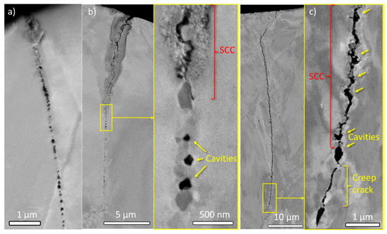 SEM-BSE images of cross-sections of EAC initiation in 21–31% CW Alloy 690, after testing conducted at 360 °C in simulated PWR primary water (600 ppm of B; 1 ppm of Li; 25 cc/kg dissolved H, i.e., in Ni/NiO transition conditions), showing the presence of GB cavities assisting the cracking. Three examples of the GB cavities are shown: (a) the first penetration at 5,352 h, (b) a shallow IG crack at 10,049 h, and (c) a mature crack at 11,709 h [61], reproduced from [63], with permission from Elsevier, 2020.