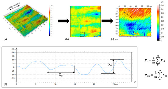 Interferometric mapping of a High-Li aluminum alloy. (a) 0.8 mm × 0.8 mm 3D surface mapping. (b) In plane projection of the surface heights. (c) zoom on a 100 µm × 100 µm area. (d) Typical line profile is taken perpendicular to the slip bands from which the quantities Pc and Psm are evaluated.