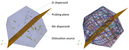 The enforced boundary conditions aim at representing an isolated grain embedded in a much bigger polycrystalline sample. The grain boundaries consist of sets of facets that prevent the dislocations from escaping the simulated box. Here the simulated volume consists of a spherical grain of 5 μm of diameter approximated by a set of 24 facets. The particles are also geometrically defined by sets of triangular facets acting as impenetrable obstacles. The simulated volume contains distributed spherical particles representing zirconium dispersoids, and ellipsoidal particles representing manganese dispersoids, as shown in Figure 3.