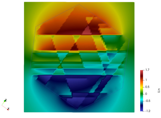 Initially, all simulations contain the same number and type of dislocations, but those are placed in the volume randomly according to the particle position to avoid overlap. There are 24 dislocations initially introduced in the volume, six dislocations per each of the four active slip systems C1, C5, A6, and A2. These dislocations are 260 nm long, and their initial direction and type are randomly selected. A typical DDD simulation lasts 2.5 h on a single Intel Xeon E5405 processor with eight threads. Once the simulations are completed, a 5 µm squared (0–11) calculation plane is inserted in the volume (see Figure 3) to visualize the spreading of the plastic strain inside the grain. The calculation plane is discretized into a grid of 100 × 100 points.