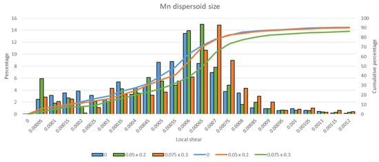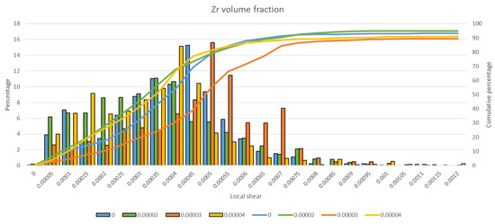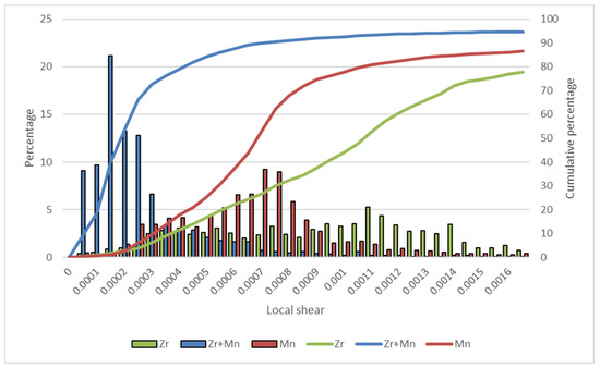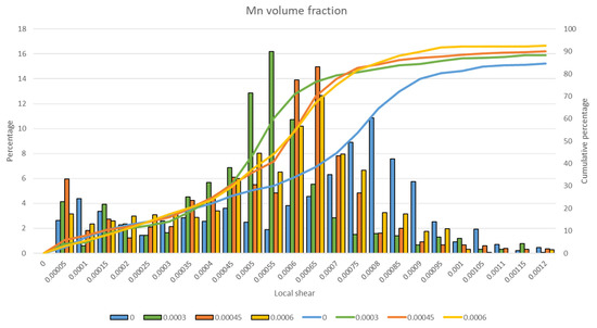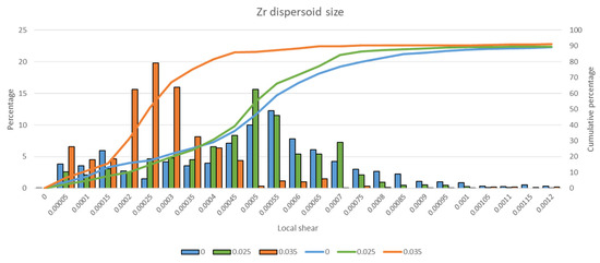 The histograms of the local shear are plotted in Figure 6 together with the cumulative percentages, which better indicate the average values. The simulation with only Zr dispersoids admits an average local shear of = 0.001. The local shear measured from the simulation with only Mn dispersoids is decreased by 30%: 0.0007, and when both particles are present, the local shear reduces to which is 5 times less than the case of solely Zr dispersoids. It can be concluded that the combined presence of Mn and Zr dispersoids is the most efficient manner to reduce the strain localization, which is consistent with the experiments presented in the previous section.