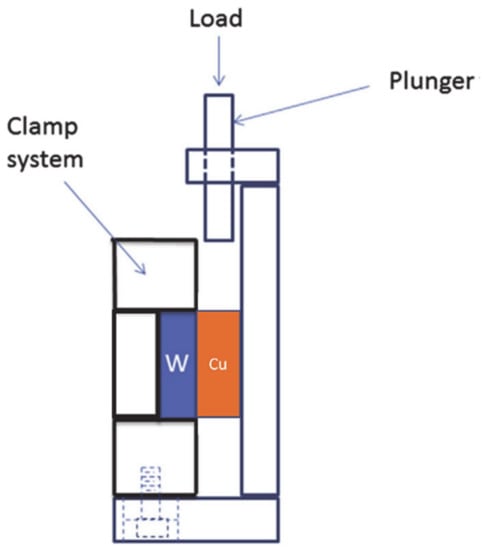 To evaluate the effect caused by the brazing process on the base materials, microhardness profiles across the joint were obtained by MHV-2 equipment (Shimadzu, Kioto, Japan). A load of 1 N was applied for 30 s from copper alloy to W and three indentations were made for each microhardness value. The strength of the joint was evaluated with a UTM machine Z100 (Zwick, Ulm, Germany) using a special shear fixture designed for that purpose shown in Figure 1. Three samples were measured to obtain the mean value along with its standard deviation. The objective is to avoid the misalignment of the joint interface during the tests and to ensure the pure shear stress of the joint. Pure shear allows obtaining information about the joint interface strength when the load is distributed, at least theoretically, homogeneously through the interface plane. This configuration is desired when the strength of the base metals are higher than the joint interface [,,,,]. The shear tests were carried out at a velocity of 1 mm/min.