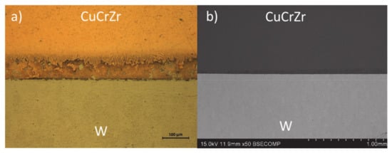 Figure 2a,b shows general micrographs of the W-CuCrZr joints obtained by optical microscopy and SEM. They confirmed that the first step of the joint development has been achieved. There is no sign of wetting or porosity defects in any of the interfaces reaching 100% of metallic contact.