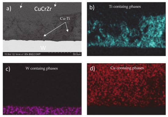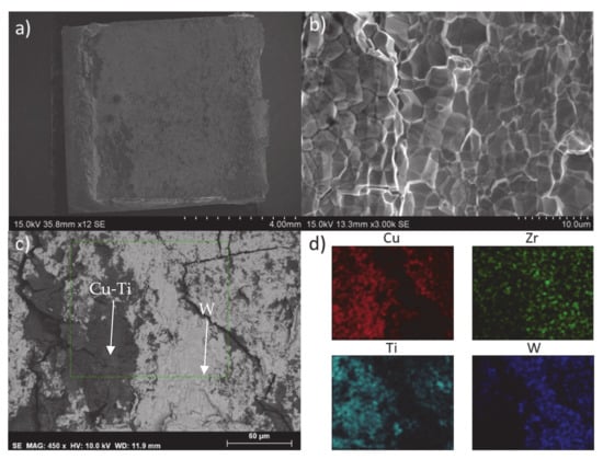 Figure 7c,d shows the fracture surface of the CuCrZr obtained by the back-scattering detector and EDS elemental distribution map of the selected area, respectively. In this case, the presence of Cu-Ti and W phases were detected, arrowed in Figure 7c and visible at the elemental mapping distribution in Figure 7d. This could be an indication that fracture propagated along the W-braze interface following the Cu4Ti brittle phase or through the tungsten base material that remained adhered to the CuCrZr base material. This fact shows the good adhesion properties of the braze.