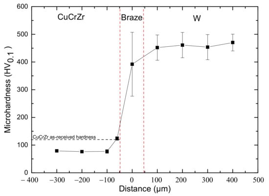 Microhardness profile of the W-CuCrZr brazed joint across the braze.