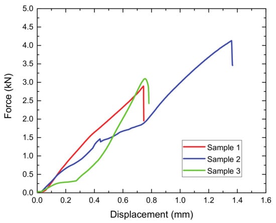 The force–displacement curves of the shear strength tests are shown in Figure 6. Two samples withstand 3 kN and the third one 4 kN. Fracture occurred with no apparent plastic deformation at displacements of 0.6 and 1.3 mm, respectively. The average shear strength was 96 ± 15 MPa, which is in the range of other works using the brazing technique. For example, Peng et al. also used Cu-Ti filler alloy, but using Ti richer contents, the filler applied to W-CuCrZr joints obtained 96 ± 18 MPa []; and Singh et al. obtained a strength of 22 MPa in the W-CuCrZr joint using a pure Cu interlayer when they joined a multilayered component [].