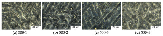 The microstructure images of the samples fabricated by SLM with different shielding gas volume flows are shown in Figure 7. Under the condition of 500 L/min, many particle inclusions along with the lack of fusion defects can be observed in the samples. When the shielding gas volume flow was 550 L/min or 600 L/min, no lack of fusion defects was observed, only a few small pores and inclusion defects inside the samples.