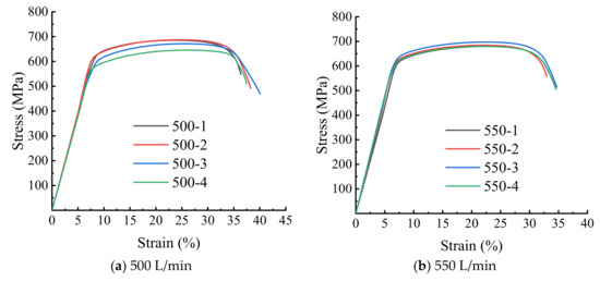 The uniaxial tensile test stress-strain curves of 316L sample fabricated by SLM under different shielding gas volume flows are illustrated in Figure 9. Every curve is the average of the uniaxial tensile samples at the same Y position. There are significant differences among the tensile properties of samples at different positions when the shielding gas volume flow was 500 L/min. The tensile strength of 500-1 and 500-2 samples are much higher than that of the 500-4 sample. When the shielding gas volume flow was 550 L/min and 600 L/min, there is no significant differences among the tensile properties of samples at different positions. With the increase in shielding gas volume flows, the difference in the tensile properties of the samples at different positions on the base plate gradually narrowed.