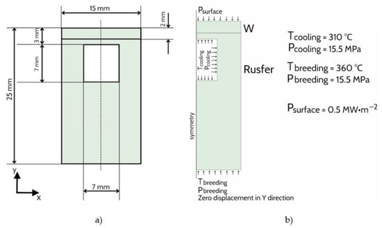 We calculated a simplified part of the FW component by means of Finite Element Analysis in ANSYS Workbench 18.2. The test component and the boundary conditions for modeling are shown in Figure 1. The temperatures used are mean values, designed for cooling and breeding in the WCLL blanket. The geometry was designed based on the parameters presented in [32]. The 2-mm-thick tungsten and reduced activation ferritic-martensitic steel (RAFM) Rusfer were modeled, and the properties of the materials were taken from [26].