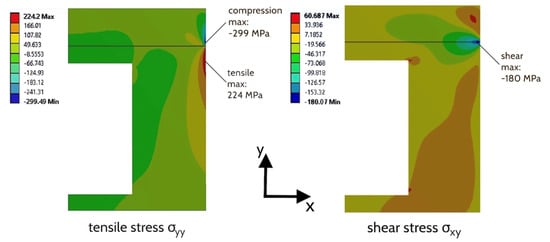 Contour plots of the stress component distributions at full heat load. Only the right half of the symmetric test component is depicted.