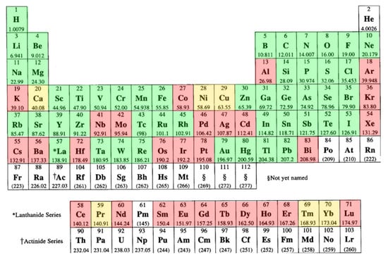 Periodic table of the elements with residual activity of the elements 100 years from the end of operation: green—less than 10 mSv/h; yellow—near 10 mSv/h; red—more than 10 mSv/h [33].